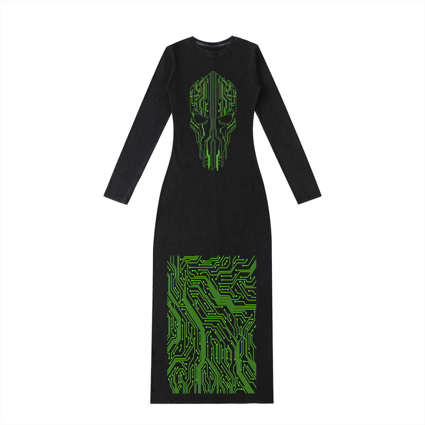 The Wired Wraith maxi dress brings a sleek, body-skimming silhouette into full dystopian mode. Neon-green circuit sigilism runs through the design, starting with a skull-like tech mask on the chest and a full motherboard grid across the lower panel. The back features vertical "CYBERSOCIETY" encrypted glyphs.
